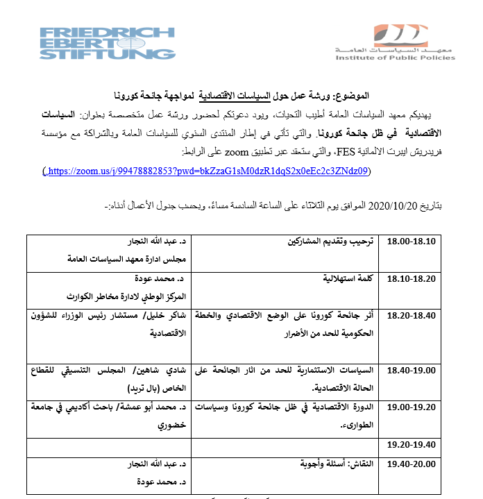 جاء ذلك خلال ورشة حول "السياسات الاقتصادية في ظل جائحة كورونا"، نظمها معهد السياسات العامة (IPP) بالشراكة مع مؤسسة فريدريش ايبرت الالمانية " FES"، باستخدام تقنية "زوم"، بمشاركة رئيس وحدة الشؤون الاقتصادية في مكتب رئاسة الوزراء د. شاكر خليل، والرئيس التنفيذي لمركز التجارة الفلسطيني محمد نسيبة، والباحث في جامعة "خضوري" د. محمد أبو عمشة، ود. محمد مقدادي من المجموعة الفلسطينية لإدارة الأزمات والكوارث في غزة، ورئيس المركز الوطني لإدارة مخاطر الكوارث د. محمد عودة، وعضو مجلس إدارة المعهد د. عبد الله النجار.