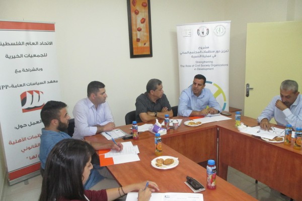 وجاءت هذه النقاشات خلال لقاء مفتوح حول الحق في تكوين الجمعيات بين الواقع و الاطار القانوني الناظم، في مركز مسارات "معهد السياسات العامة" نظم برعاية الاتحاد العام الفلسطيني للجمعيات الخيرية بالتعاون مع مركز مسارات للدراسات الاستراتيجية ضمن مشروع تعزيز دور منظمات المجتمع المدني في عملية التنمية و التذ تنفذه شبكة المنظمات الاهلية ) وبدعم من الاتحاد الاوروبي)وشارك فيها عدد من الحقوقيين ومثلين مؤسسات اهلية فلسطينية اضافة الى ممثلين عن هيئة المنظمات الاهلية، وادار اللقاء الدكتور محمد عودة و قدم كل من الدكتور احمد ابو دية عرضا عن واقع منظمات العمل الاهلي و نشاتها في فلسطين و مراحل تطورها، و قدم كذلك عرضا للبيئة القانونية التي رافقت تطور عمل المؤسسات الاهلية في فلسطين.